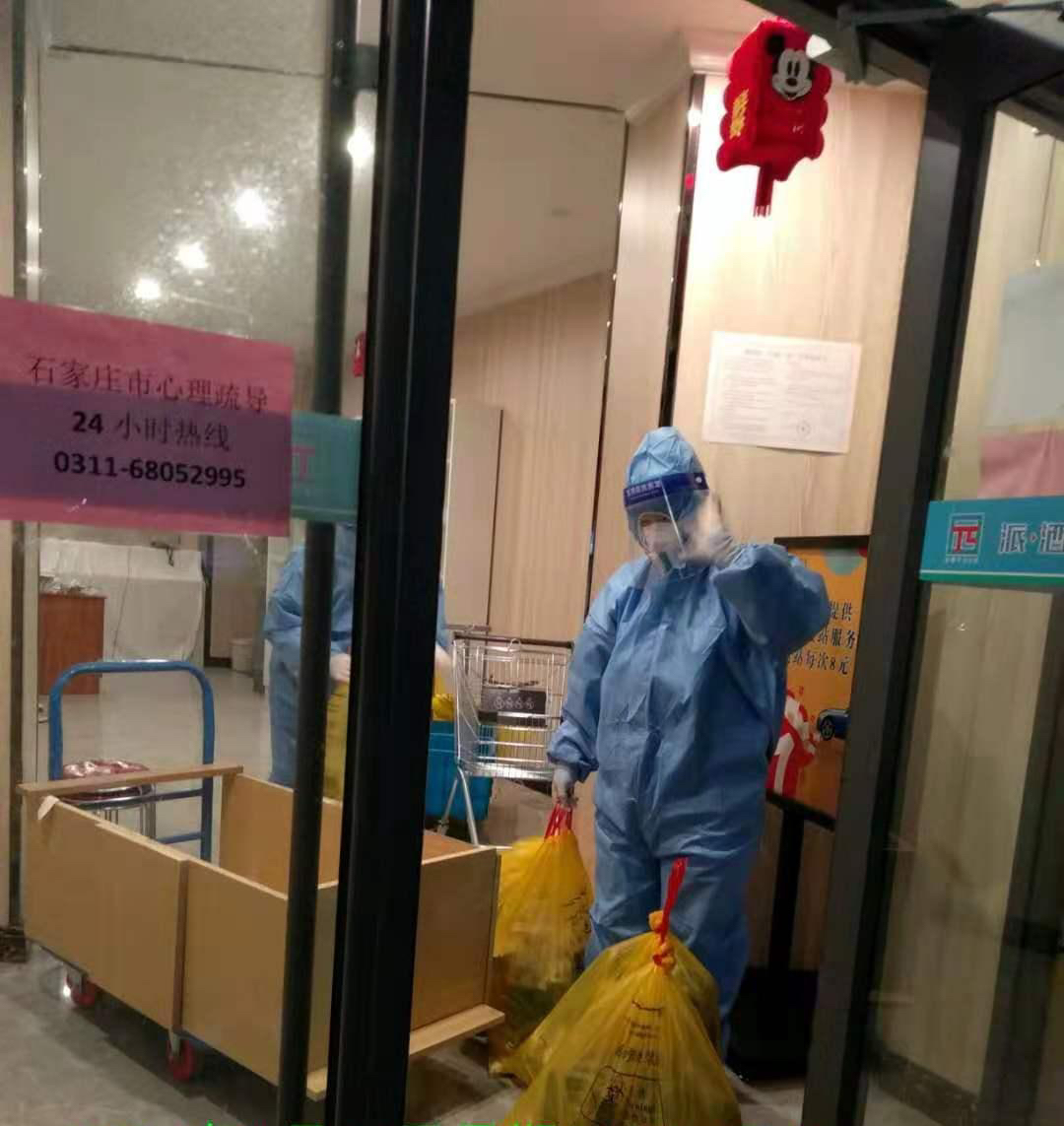 隔离人员都是紧急隔离到酒店的,难免有会缺东少西的情况,还有一些老人、儿童的一些特殊需求,包括小孩哭闹的情况,酒店服务人员以及志愿者第一时间帮助解决 ,志愿者还为儿童送去了玩具 ,安抚了老人 ,及时解决他们的问题。 身穿防护服的工作人员为隔离人员一日三餐送饭并处理垃圾,消杀,当他们结束一天的工作脱下防护服的时候浑身已经湿透、脸因长时间佩戴口罩通红、及一圈的压痕,但他们依旧迎难而上努力克服 把每一个房间里客人的需求牢牢的记在心里, 这些辛苦的身影让我们为之感动、为之震撼。 这场战役打响的第一时间我成为一名志愿者,加入了新石街道隔离点服务 ,在这里我看到的是一个个温暖的人 ,感受到一件件暖心的事,以及隔离人员感谢的目光。